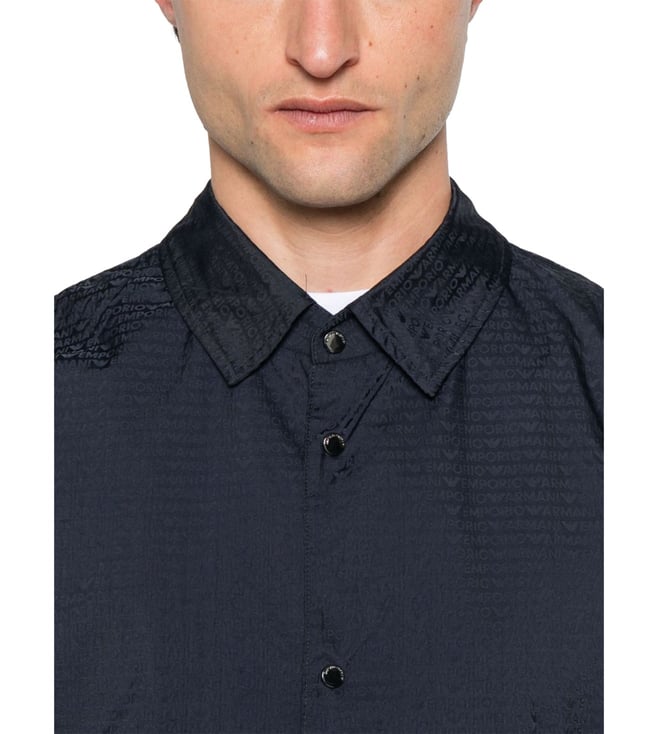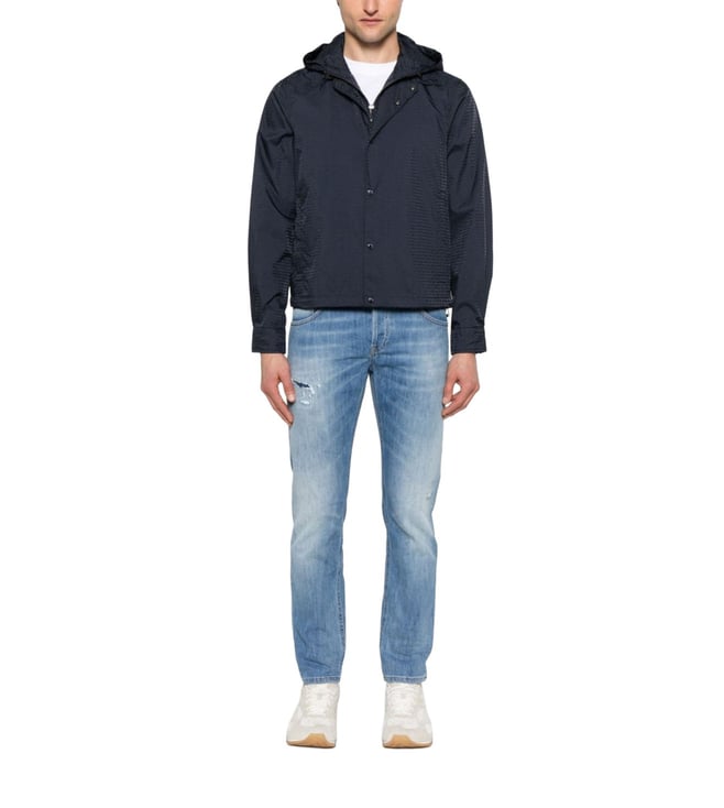 Elevate your style with the Emporio Armani Navy Regular Fit Jacket. Pressstud fastening concealed front zip fastening detachable drawstring hood two front welt pockets this piece fits true to size. recommend you get your regular size model is 1,84m / 6ft 1in wearing size 48 (it).