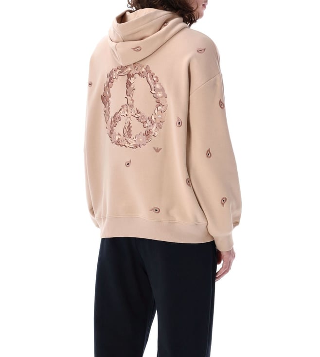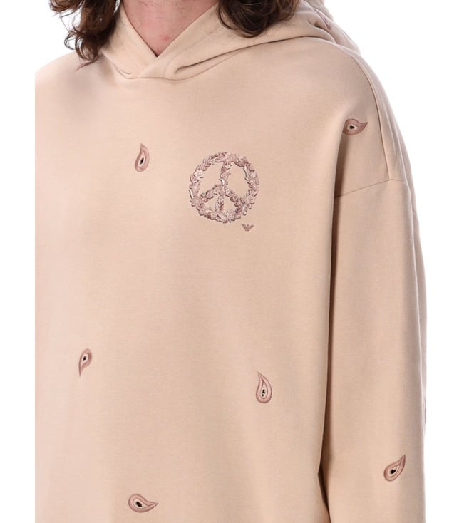 Elevate your style with the Emporio Armani Beige Printed Oversized Fit Hoodie. Classic hood drop shoulder long sleeves ribbed cuffs and hem.