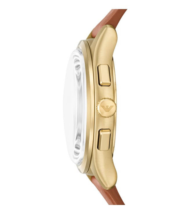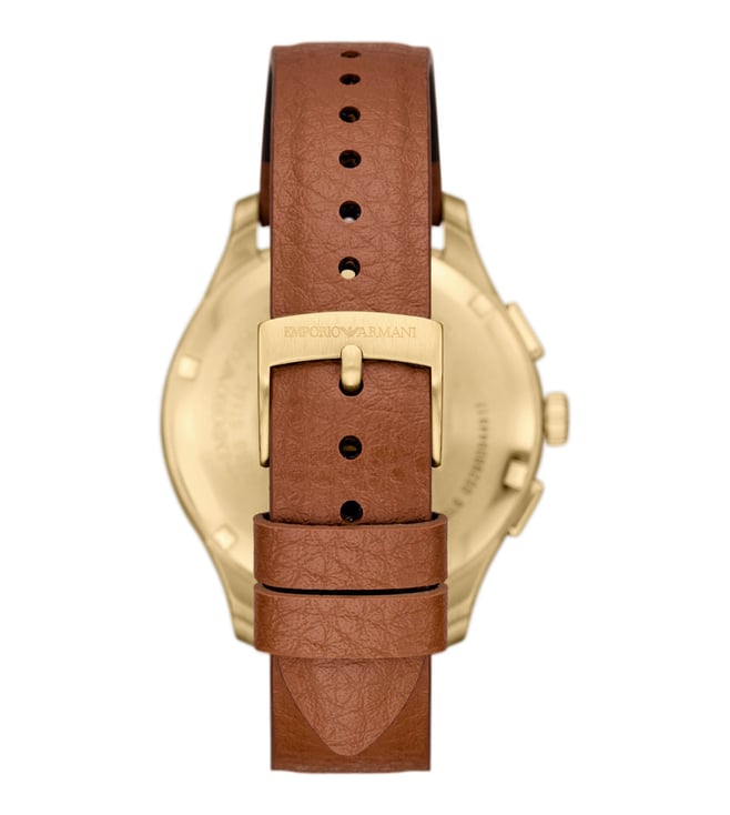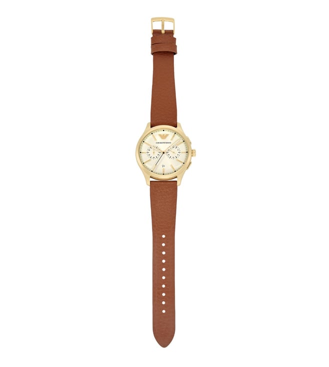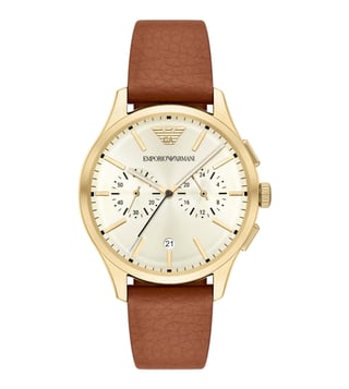 Elevate your style with the Emporio Armani Quartz Chronograph Mens Watch AR11714. This 42mm timepiece boasts a Japanese movement, ensuring precision and reliability. The brown leather strap adds a touch of sophistication, while the cream sunray dial with two sub-eyes offers added functionality. Housed in a round gold-tone stainless steel case, this watch is a timeless accessory for the modern gentleman who values both style and substance. Make a statement with this sleek and versatile timepiece that effortlessly transitions from day to night.