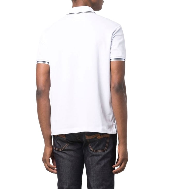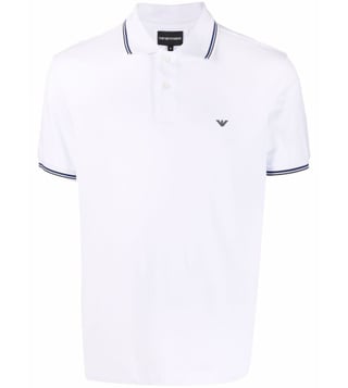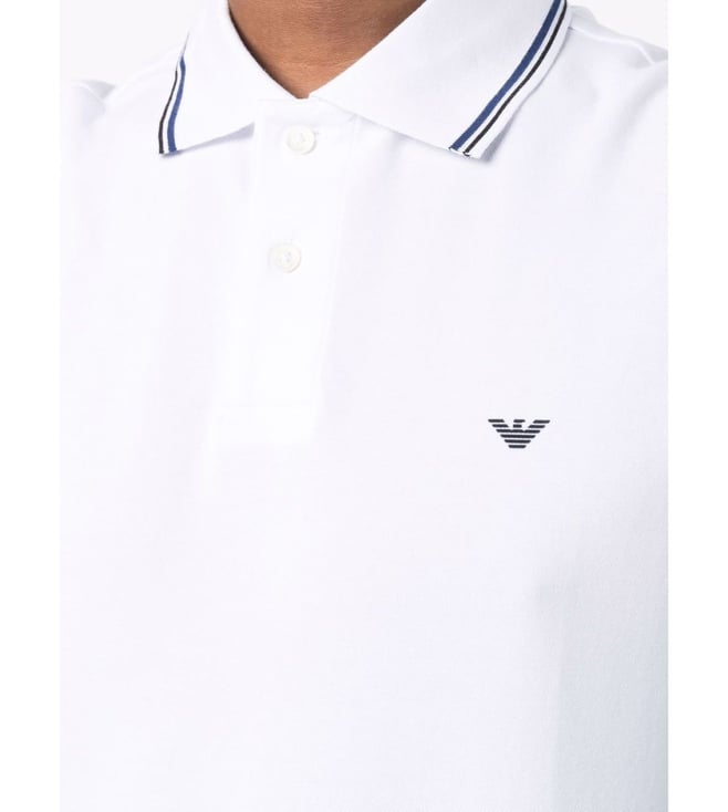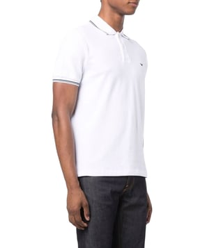 Elevate your style with the Emporio Armani White Embroidered Logo Regular Fit polo t-shirt. Bright white stretchcotton logoprint cotton polo shirt from emporio armani featuring jersey knit, logo print at the chest, polo collar, front button placket, short sleeves and straight hem. This piece fits true to size. recommend you get your regular size model is 1,84m / 6ft 1in wearing size m.