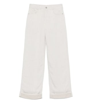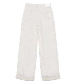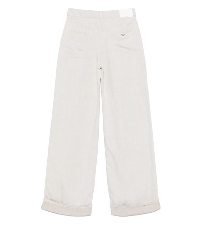 Elevate your wardrobe with the Emporio Armani White Flared Jeans. Designed with zip fly, button closure, belt loops, pockets, composition: linen/flax/lyocell, this piece fits true to size. we recommend you get your regular size, model is 1, 75m / 5ft 8in wearing size 27 (waist cm), these trousers combine comfort and sophistication for everyday wear.
