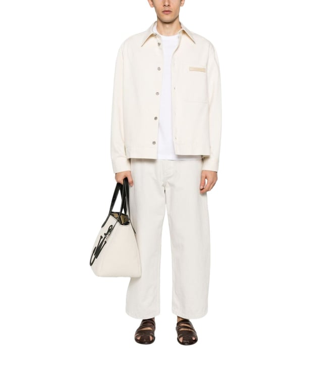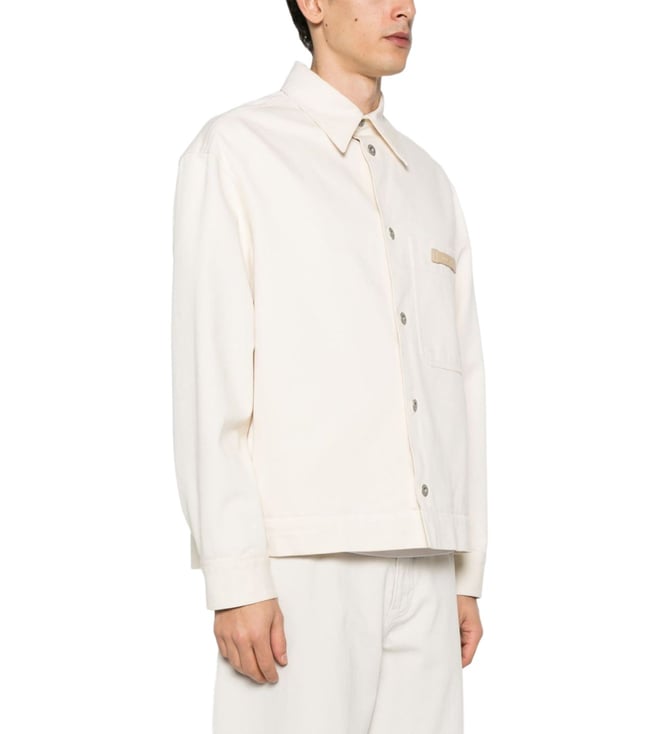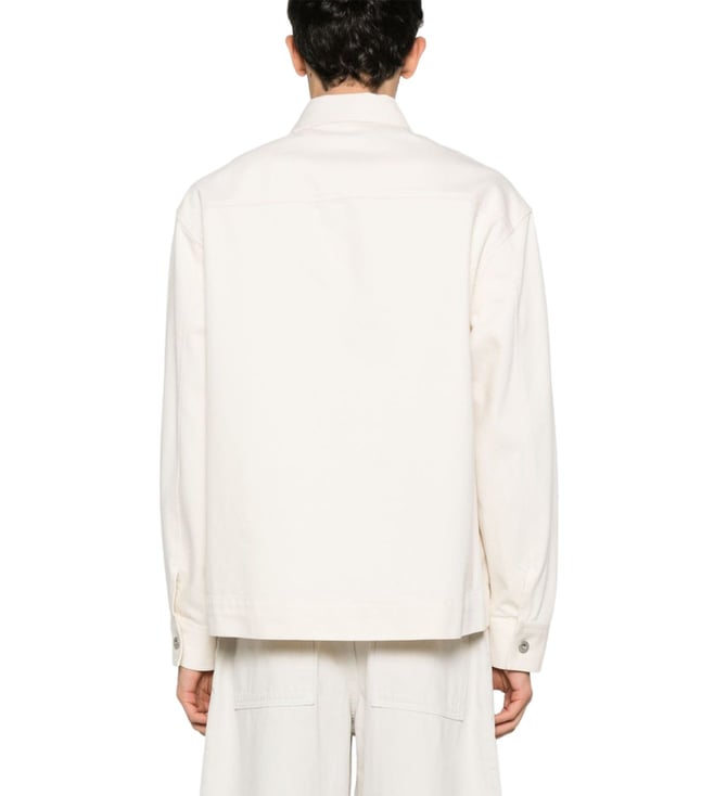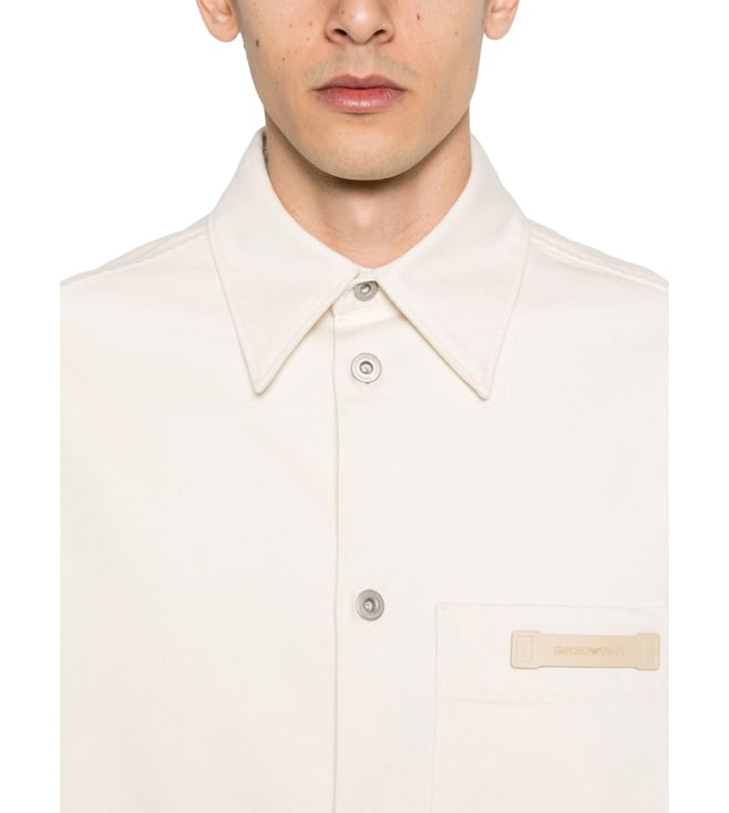 Elevate your style with the Emporio Armani Off White Icon Regular Fit Denim Jacket. Front button fastening chest patch pocket buttoned cuffs classic collar this piece fits true to size. recommend you get your regular size model is 1,84m / 6ft 1in wearing size 48 (it).