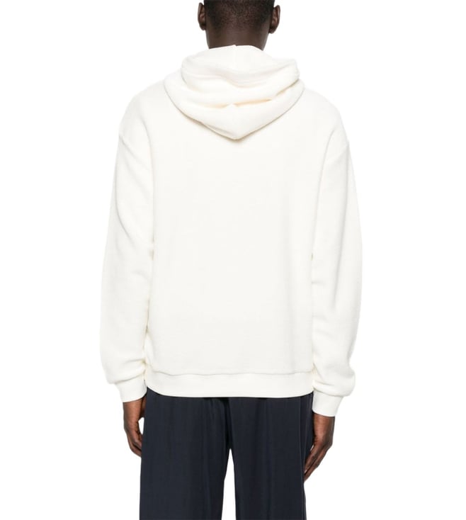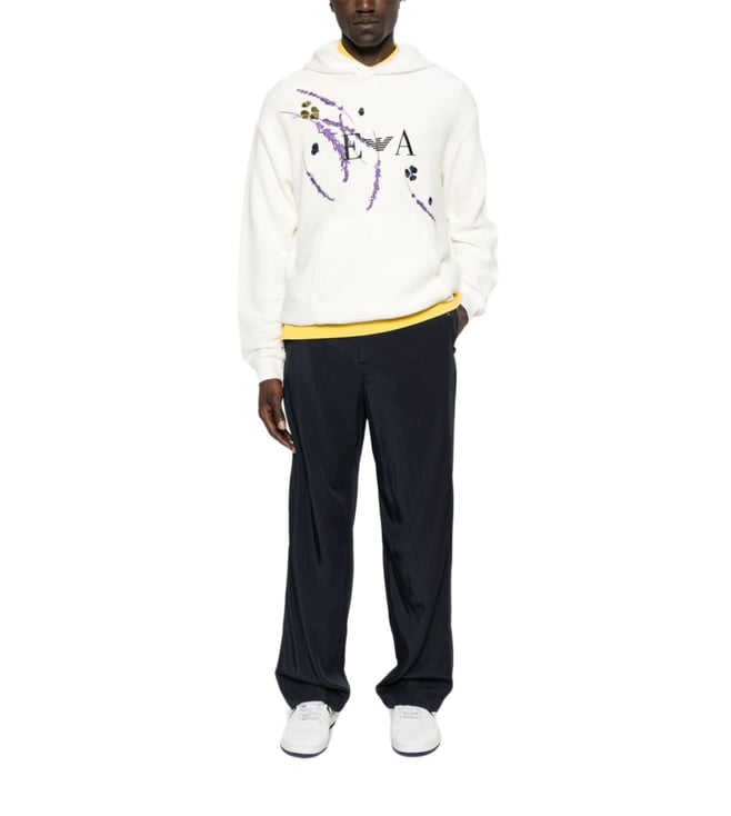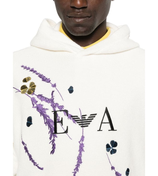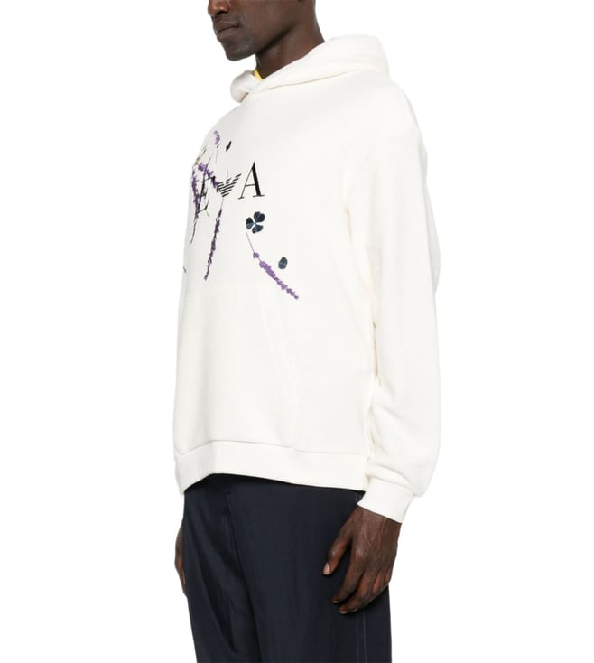Elevate your style with the Emporio Armani Off White Embroidered Regular Fit Hoodie. Classic hood front pouch pocket drop shoulder ribbed cuffs and hem composition: cotton this piece fits true to size. recommend you get your regular size model is 1,84m / 6ft 1in wearing size m.