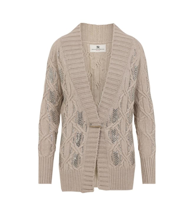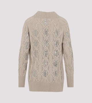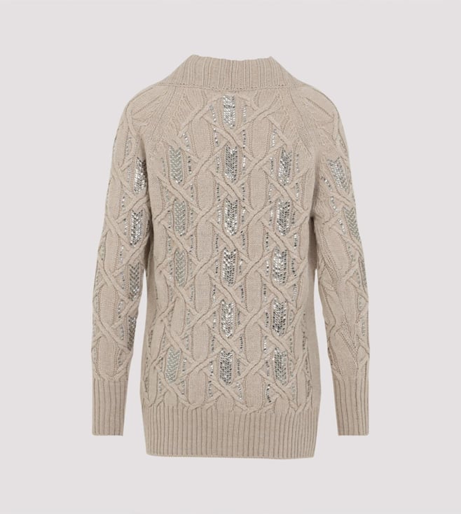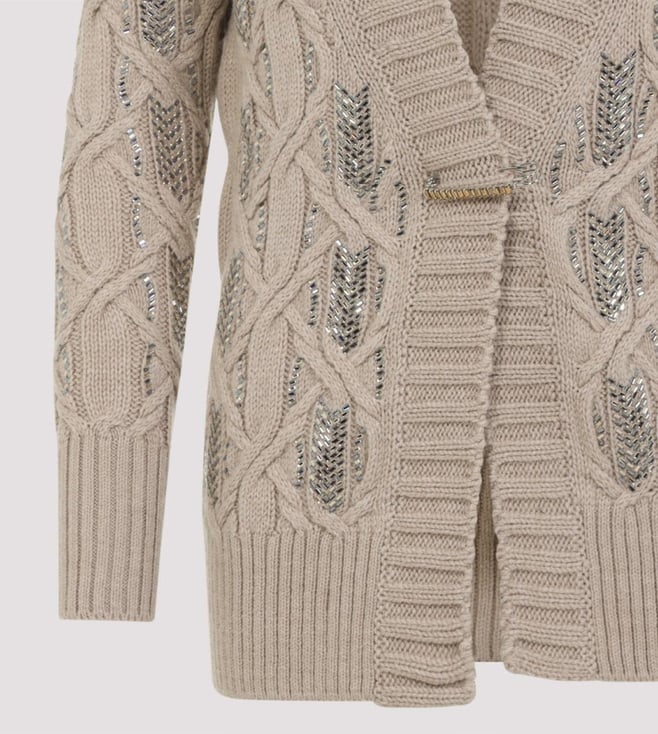 The Ermanno Scervino Beige V-Neck Cardigan is a luxurious blend of 70% virgin wool and 30% polyacrylic, offering a soft yet durable feel. Its elegant beige hue complements the intricate pattern, adding a touch of sophistication to any ensemble. Designed for women, this cardigan features a classic V-neckline and a seamless closure, ensuring a sleek silhouette. Perfect for layering, it effortlessly transitions from casual to chic, making it a versatile staple in any wardrobe.