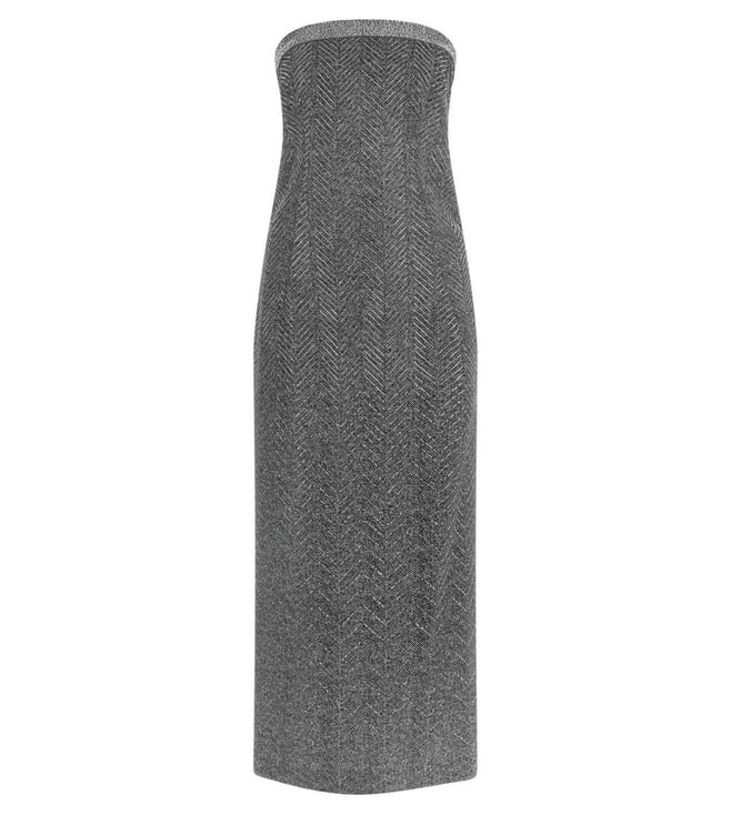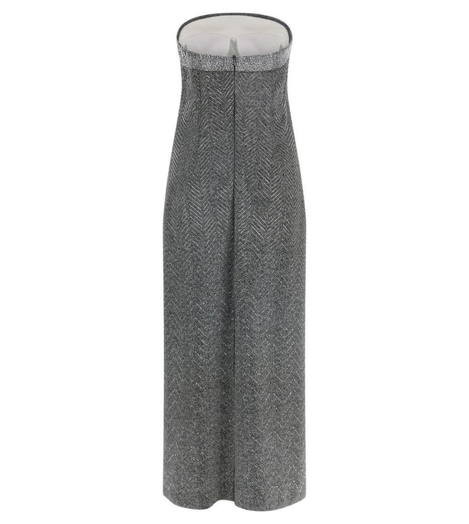 A captivating grey dress that exudes elegance and modernity, this piece features an exquisite embellished pattern that shimmers with every movement. Designed for the confident woman, its sleeveless, strapless silhouette highlights the shoulders and neckline, offering a sophisticated allure. Crafted from a luxurious blend of 96% viscose and 4% elastane, it promises a comfortable, flattering fit. The discreet closure ensures a seamless finish, making it perfect for any chic occasion.