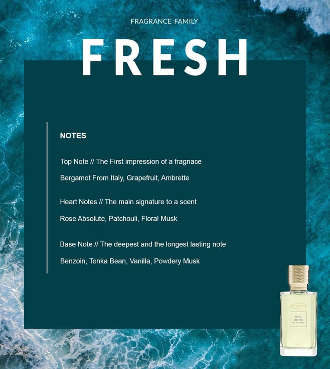 Bergamot From Italy, Grapefruit, Ambrette, Rose Absolute, Patchouli, Floral Musk, Benzoin, Tonka Bean, Vanilla, Powdery Musk