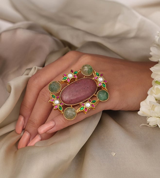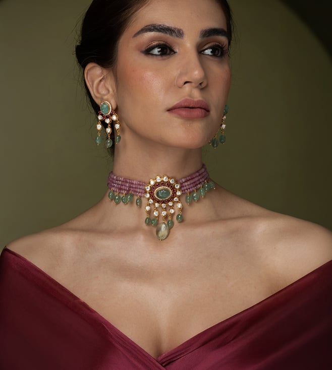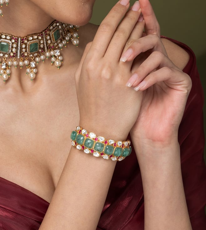 Green, Gold & White Polki And Green Beads Jhumka Earrings
