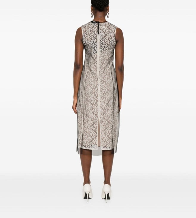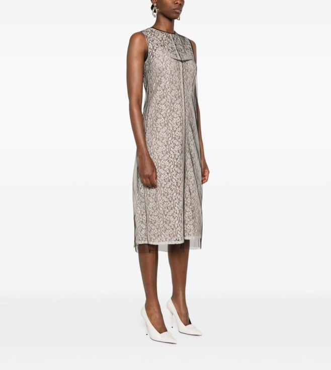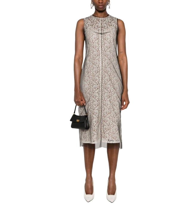 Embrace timeless elegance with this exquisite beige dress, adorned in a delicate floral pattern that whispers sophistication. Crafted from a luxurious blend of 100% silk, 72% cotton, and 28% polyamide, it offers a sumptuous feel against the skin. The sleeveless design and round neck create a classic silhouette, perfect for any occasion. A discreet closure ensures a seamless fit, making this dress a versatile addition to any wardrobe, effortlessly blending comfort with style for the modern woman.