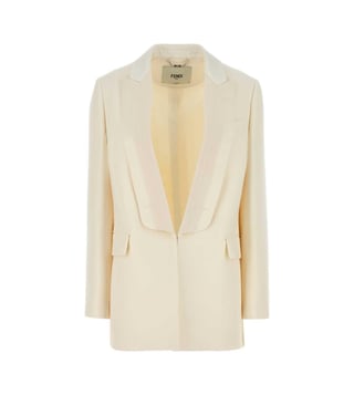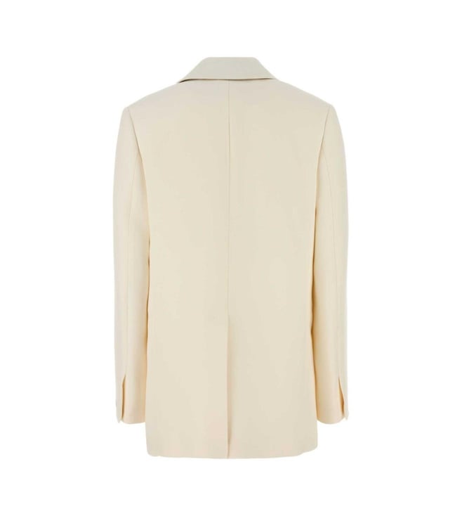 Elevate your wardrobe with this exquisite off-white blazer, a harmonious blend of sophistication and style. Crafted from a luxurious wool-silk blend, its solid pattern exudes timeless elegance. The long sleeves and lapel collar add a touch of classic refinement, while the viscose lining ensures comfort and breathability. Designed for the modern woman, this blazer features a sleek closure, making it a versatile piece for both professional and social settings. Embrace effortless chic with this wardrobe essential.