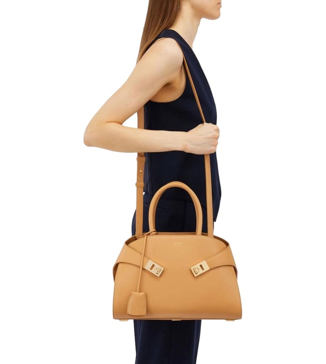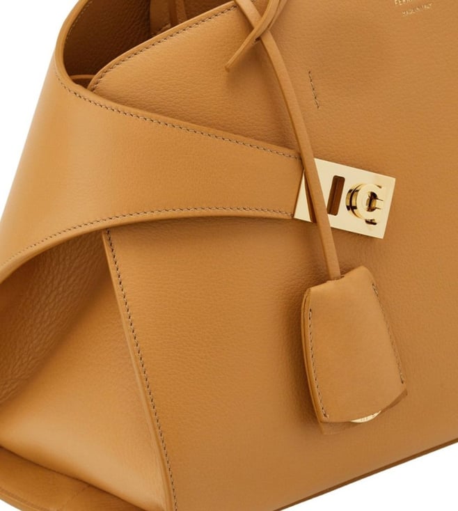 Expand the collection of your accessories in a trendy way with this bag from Ferragamo. Light brown leathersmooth grainleather tagtwo rolled top handlesgancini bucklemain compartmentinternal zip-fastening pocketmetal feetsilver-tone hardwareleather 100 percent Products purchased from Darveys are supported exclusively by the warranty/exchange policies of Darveys and its partner boutiques. Brand owners and their channel partners are not responsible for exchange/warranty services for items purchased through Darveys.