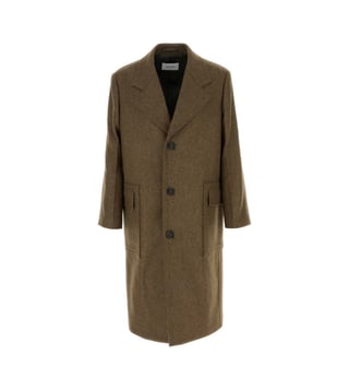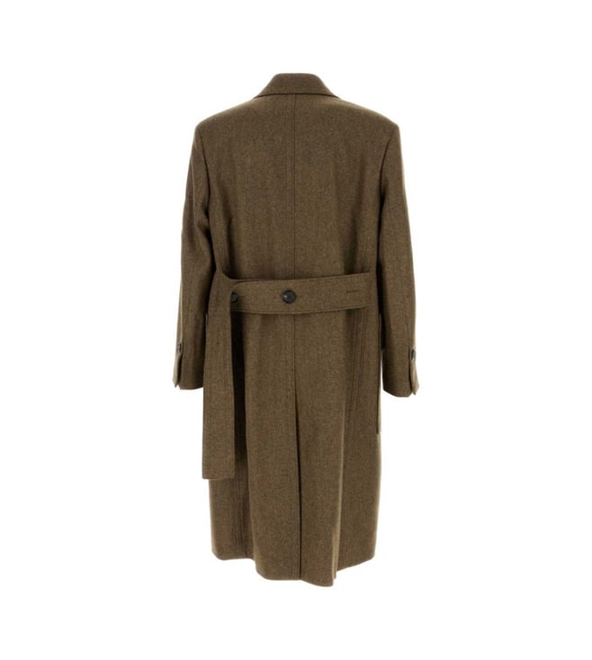 Upgrade your outerwear collection with the Ferragamo Olive Belted coat. Crafted with high-quality materials, this trench coat features olive green, virgin wool, front button fastening, notched lapels, long sleeves, buttoned cuffs, two front flap pockets, belted waist, central rear vent, knee-length. for unmatched warmth and style. The sleek design offers a flattering silhouette, while the versatile color and fabric ensure it complements any outfit. Perfect for both casual outings and formal events.