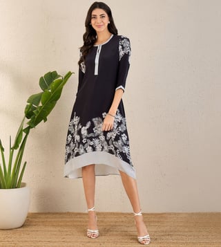 Indulge in stylish comfort with this beautiful black and grey floral printed slimline kaftan dress by First Resort By Ramola Bachchan. Made with soft viscose crepe fabric, it features 3/4th sleeves and is perfect for casual occasions, making it a must-have for women.' Disclaimer: All other items in the image are only for display purposes and will not be a part of the delivery content. Product colour may slightly vary due to photographic lighting sources. Country of Origin - India.