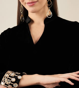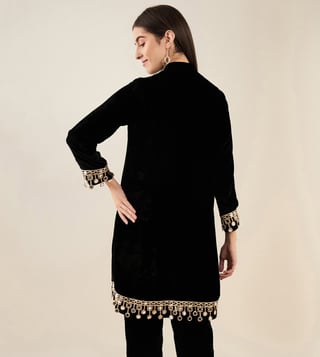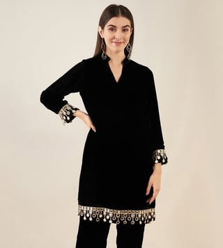Look glamorous in this black silk velvet kurta from First Resort By Ramola Bachchan. The mirror lace detail adds a touch of elegance to this 3/4 sleeve kurta, making it perfect for ethnic wear occasions. Made with a blend of silk velvet and nylon crepe fabric, this kurta is a must-have in your wardrobe.' Disclaimer: All other items in the image are only for display purposes and will not be a part of the delivery content. Product colour may slightly vary due to photographic lighting sources. Country of Origin - India.