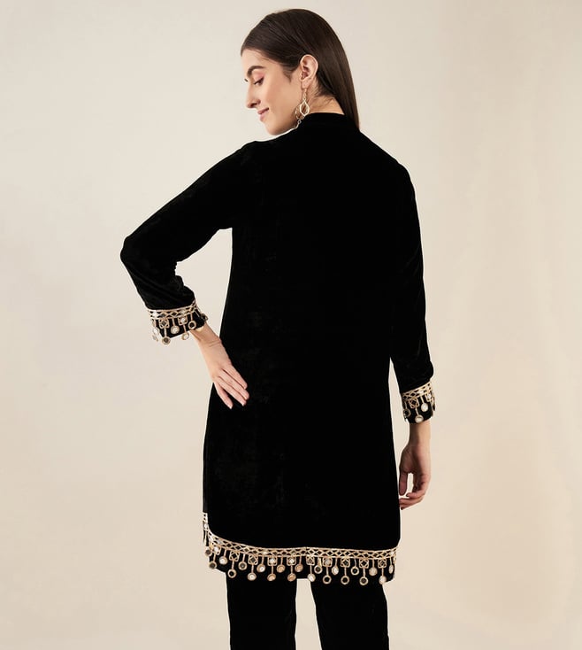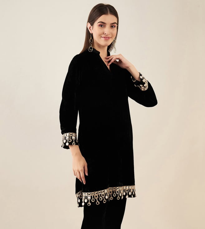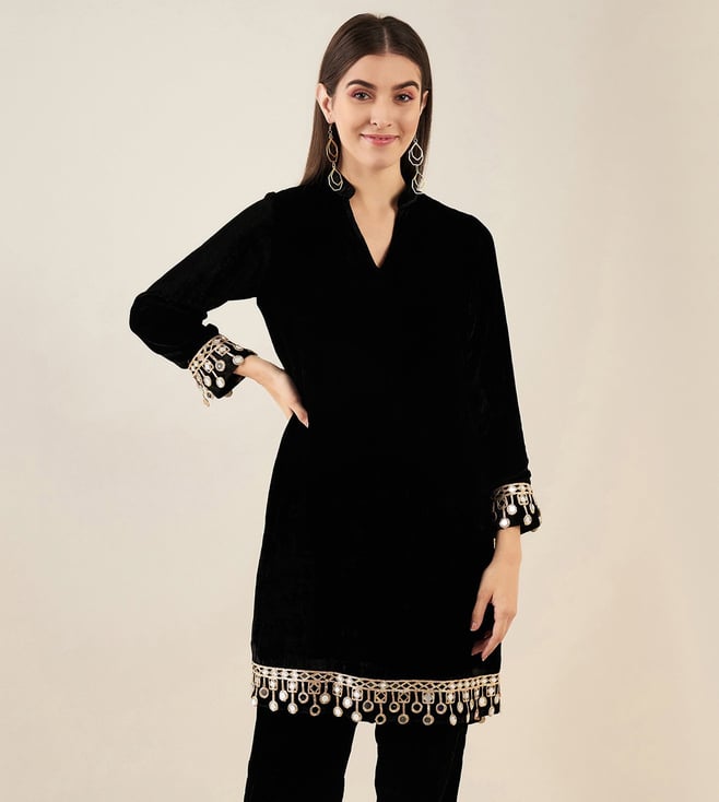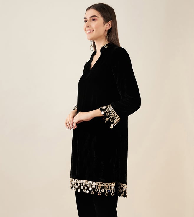 First Resort By Ramola Bachchan Black Silk Velvet Kurta with Mirror Lace Detail