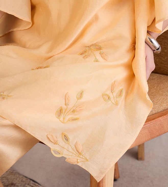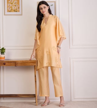 Bask in effortless elegance with this kaftan style top, adorned with intricate applique work and delicate dori detailing. Its relaxed silhouette offers airy comfort, while the handcrafted elements add a touch of artisanal charm. The soft flow and graceful design make it a perfect blend of comfort and sophistication.