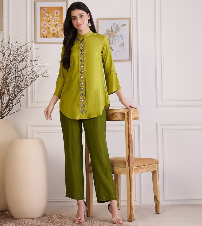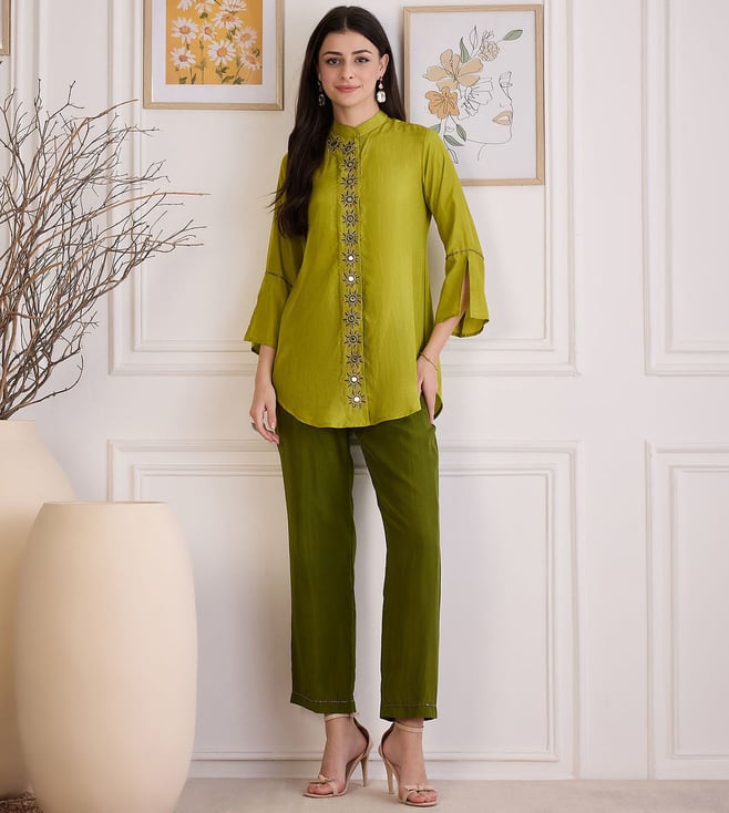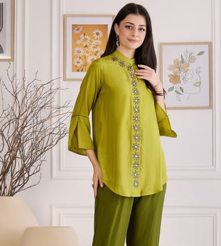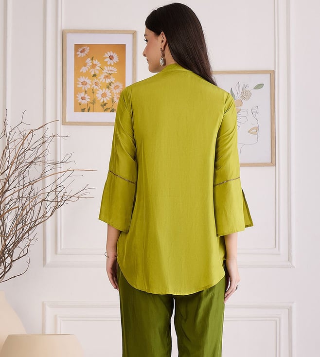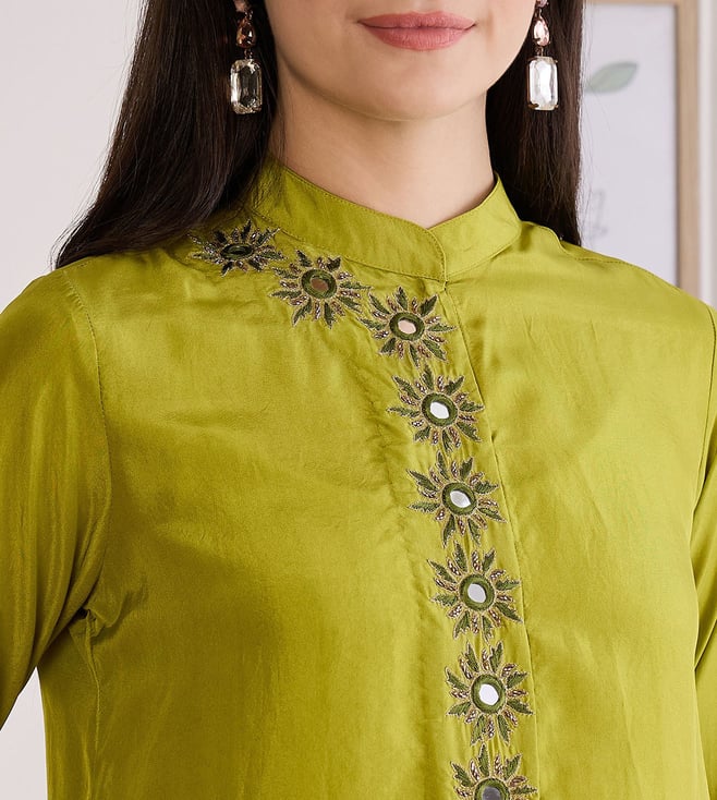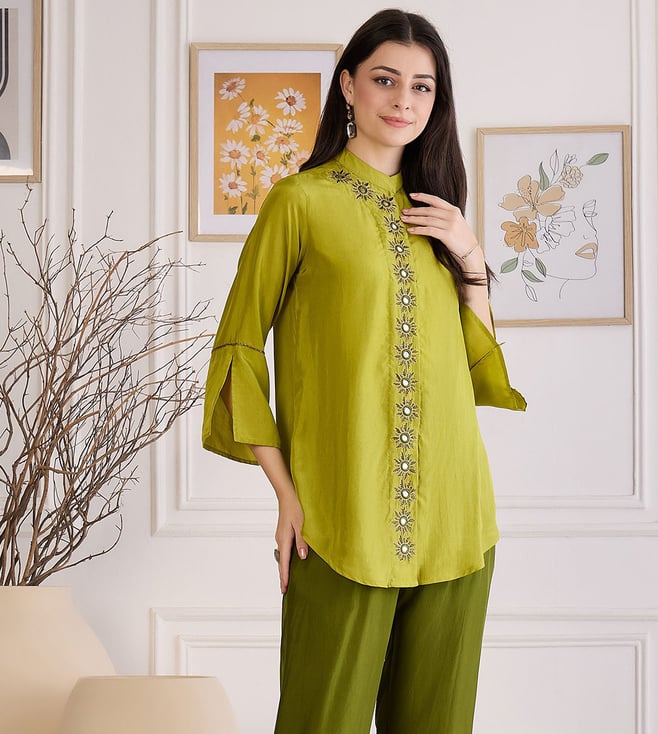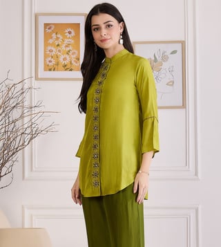 First Resort By Ramola Bachchan Furn Green Hand Embroidered Shirt Top