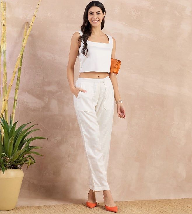 Style meets comfort in this pair of straight trousers from the Eco-Chic Vogue collection. Designed to last, it is made using 100 percent sugarcane and cotton voile. It is highlighted by two front pockets accented with elegant piping details. The hook eye and zip closure, along with a semi-elasticated waistband, ensure a comfortable and perfect fit. Disclaimer: All other items in the image are only for display purposes and will not be a part of the delivery content. Product colour may slightly vary due to photographic lighting sources. Country of Origin - India.