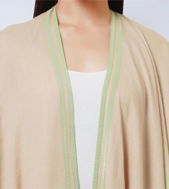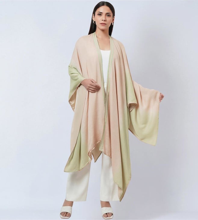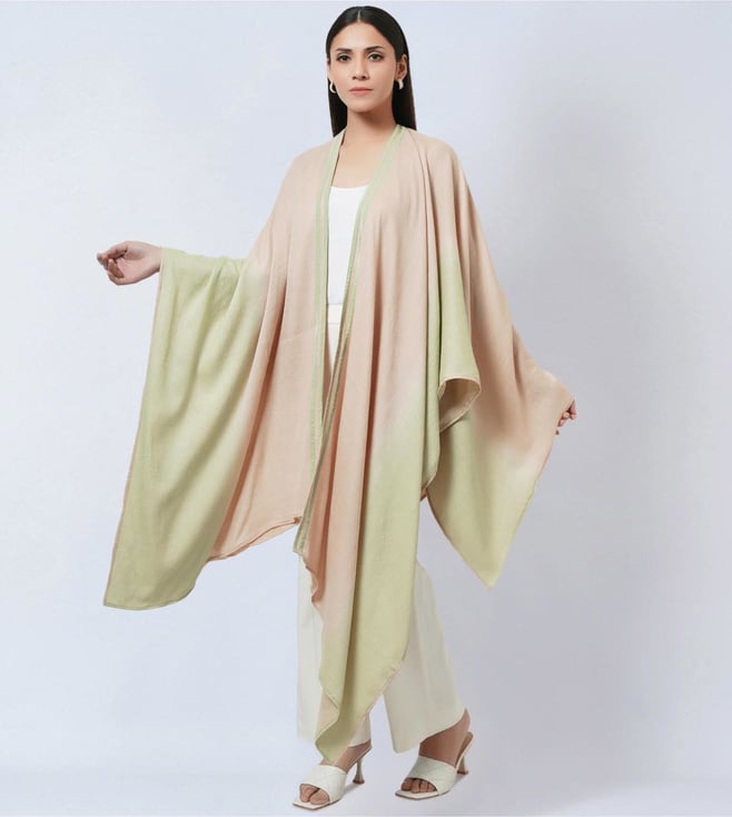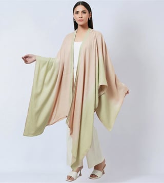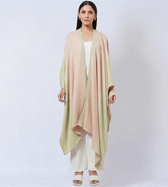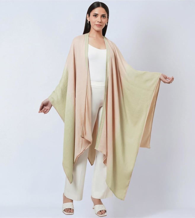 Upgrade your style by adding this two-shaded ombre cashmere cape. It is enhanced with matching stripe detailing. Disclaimer: All other items in the image are only for display purposes and will not be a part of the delivery content. Product colour may slightly vary due to photographic lighting sources. Country of Origin - India.