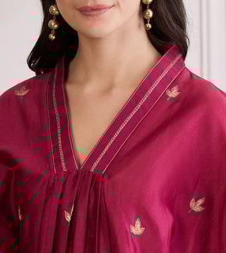 Add a touch of understated elegance with this zari embroidered top. Featuring delicate metallic embroidery and soft gathers falling gracefully from the chest, it creates a flattering silhouette with gentle movement. The shimmering zari detail adds a refined festive charm, making it an effortless choice for both day and evening wear.