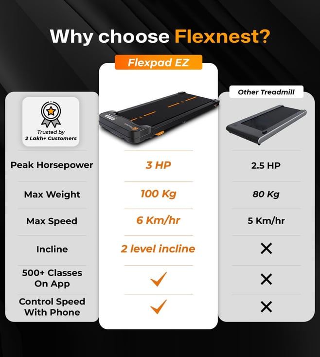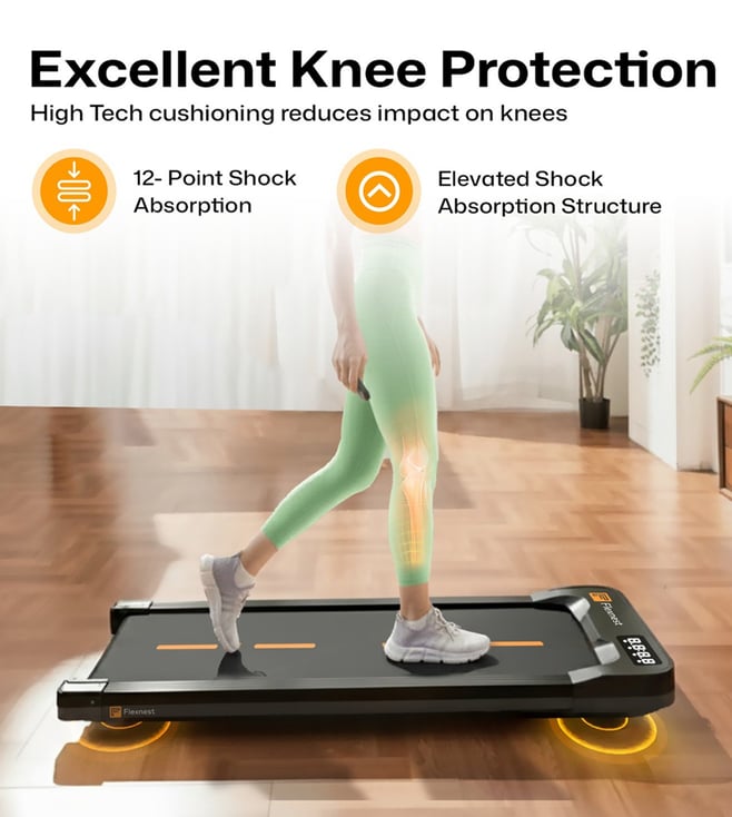 Flexnest black alloy steel treadmill offers a sturdy and modern design built for home workouts. Crafted with durable alloy steel, it ensures stability and long-lasting performance. The sleek black finish enhances any room setup. Designed to support smooth running and walking sessions, it helps maintain daily fitness goals with comfort and ease. Suitable for beginners and regular users looking for dependable exercise equipment. Flexnest flexpad EZ 3HP walking pad and treadmill 9 percent incline shock absorption 100kg capacity.