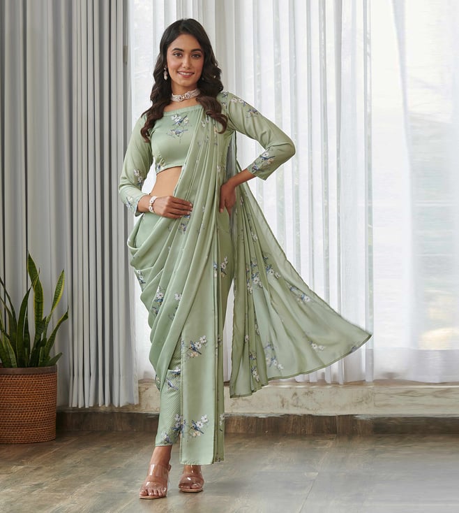 Green Swiss Satin Tailored Floral Saree With Dhoti Pants