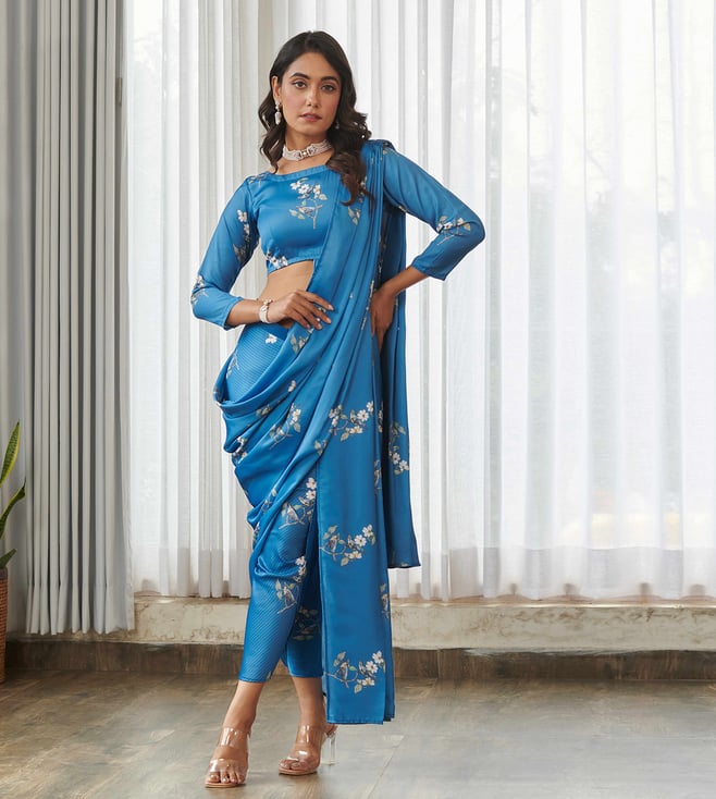 Blue Swiss Satin Tailored Floral Saree With Dhoti Pants