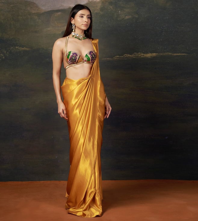 Yellow Swiss Satin Tailored Floral Saree With Dhoti Pants