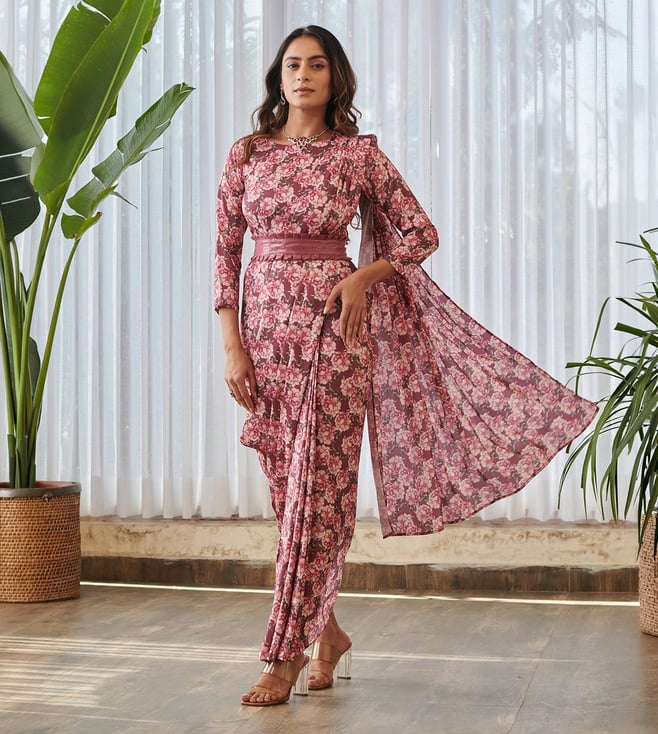 Aubergine & Pink Bella Floral Lehenga With Blouse And Dupatta