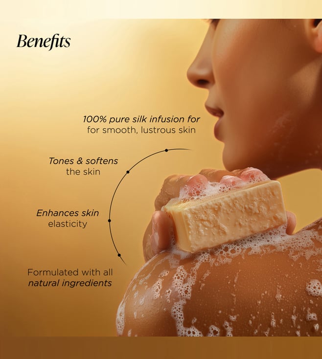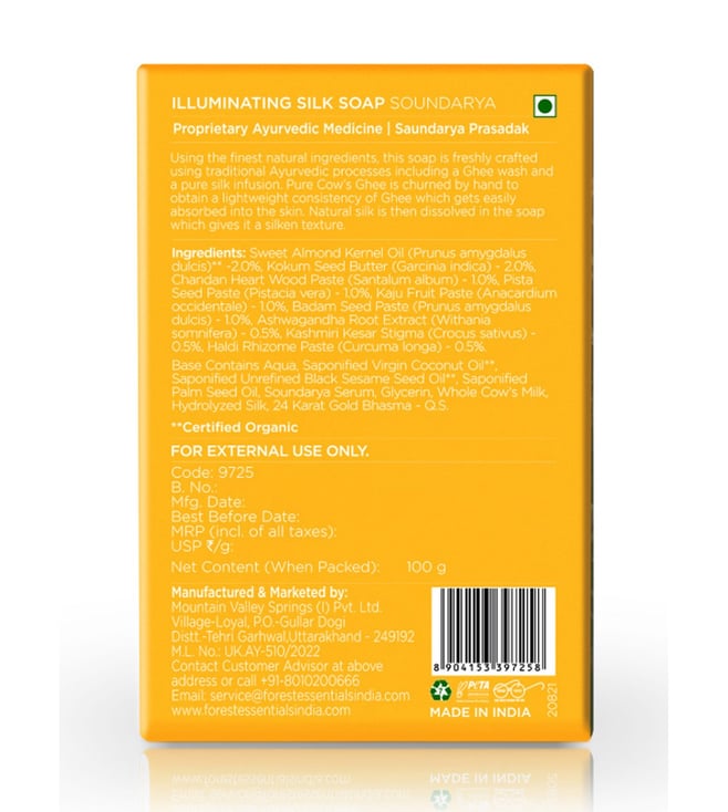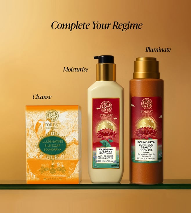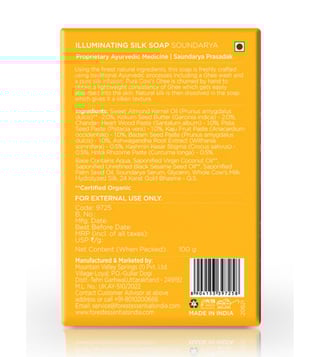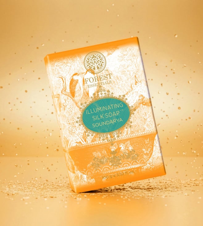The Forest Essentials Silk Soap Soundarya contains 52 herbs along with Gold Bhasma, an excellent antioxidant that penetrates into the deepest layer of the skin and provides radiance and increased elasticity. This Silk Soap leaves the skin soft, polished and glowing.