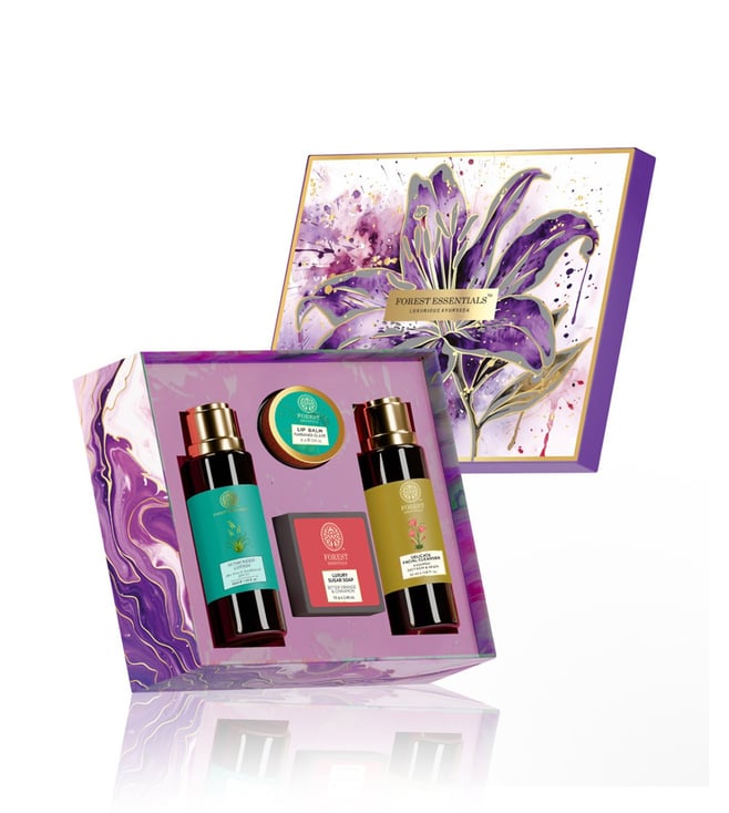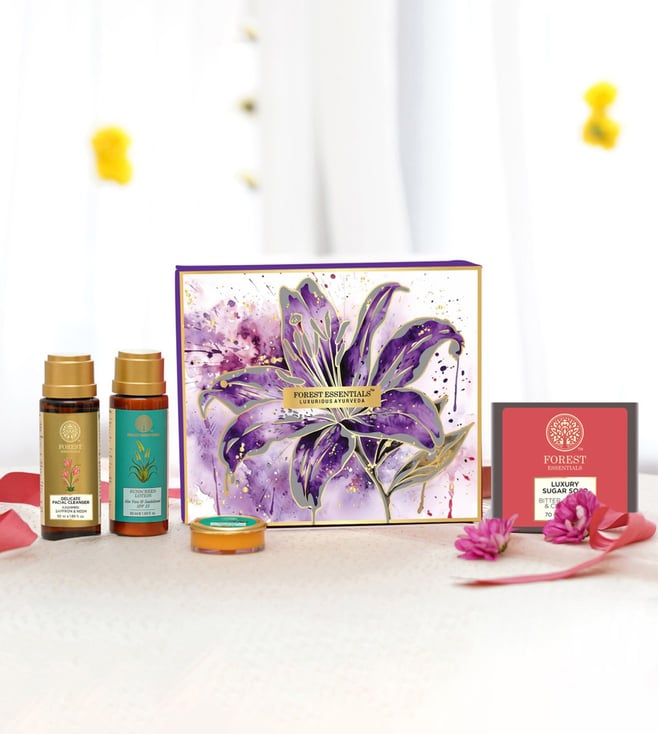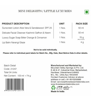 A luxurious selection of compact, convenient and travel-friendly essentials. This gift box contains Forest Essentials Aloe Vera & Sandalwood Sunscreen Lotion 25 - 50 ml, Forest Essentials Camphor & Curry Leaf Head Massage Oil - 50 ml, Forest Essentials Bitter Orange & Cinnamon Luxury Sugar Soap - 70 gm, Forest Essentials Narangi Glaze Lip Balm - 4 gm.