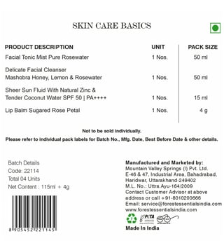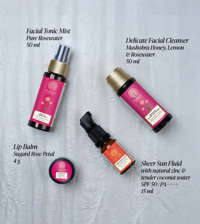 Facial Cleanser Mashobra Honey, Lemon & Rosewater ¿ Rose Flower Extract (Rosa Damascena) 15.0%, Kumud Flower Extract (Limnanthemum Indicum) 2.0%, Nagkesar Seed Extract (Mesua Ferrea) 2.0%, Honey 1.5%, Anantmool Root Extract (Hemidesmus Indicus) 1.5%, Durva Root Extract (Cynodon Dactylon) 1.0%, Lemon Peel Extract (Citrus Limon) 0.5%, Base contains Aqua, Glycerin, Royal Jelly Extract, Bee Pollen Extract, Vitamin E, Decyl Glucoside (Derived from corn starch & coconut), Coco Glucoside (Derived from glucose & coconut oil), Hyaluronic Acid, Niacinamide, Preservatives Q.S. Lip Balm Sugared Rose Petal ¿ Kokum Butter (Garcinia Indica) 7.0%, Sweet Almond Kernel Oil (Prunus Amygdalus Dulcis) 5.0%, Rose Flower Extract (Rosa Damascena) 2.0%, Rose Petal (Rosa Damascena) 0.5%, Base contains Cocoa Seed Butter (Theobroma Cacao), Beeswax (Cera Alba), Honey, Vitamin E (Tocopheryl Acetate) Q.S. Sun Fluid SPF 50 | PA++++ - Fresh Tender Coconut Water (Cocos Nucifera) 2.0%, Olive Fruit Oil (Olea Europaea) 2.0%, Sweet Almond Kernel Oil (Prunus Amygdalus Dulcis) 2.0%, Coconut Oil (Cocos Nucifera) 2.0%, Marigold Flower Extract (Tagetes Erecta) 2.0%, Basil Leaf Extract (Ocimum Sanctum) 1.0%, Aloe Vera Leaf Extract (Aloe Barbadensis) 1.0%, Turmeric Extract (Curcuma Longa) 1.0%, Green Tea Leaf Extract (Camellia Sinensis) 1.0%, Base contains Aqua, Tapioca Starch, Cetearyl Alcohol, Glyceryl Monostearate, Isopropyl Myristate, Glycerin, Propanediol (Ecocertified Humectant), Octocrylene, Avobenzone, Hyaluronic Acid, Tocopheryl Acetate (Vitamin E), Disodium EDTA, Xanthan Gum, Raw Honey, Evening Primrose Oil (Oenothera Biennis), Yasad Bhasma, Ethylhexylglycerin, Caprylyl Glycol, Hexylene Glycol Q.S. Facial Tonic Mist Pure Rosewater ¿ Natural Steam Distilled Rose Flower Water (Rosa Damascena) 100%.
