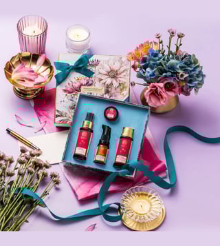 These gift boxes are thoughtfully designed, inspired by the timeless beauty of Indian florals. Let their enchanting beauty inspire you, bringing nature's elegance to your celebrations. This contains a ritual for luminous skin that starts with an SLS-free facial cleanser, hydrates and tones with the facial mist, plumps the lips with the natural lip balm and keeps the skin protected and sun fluid SPF 50 PA.