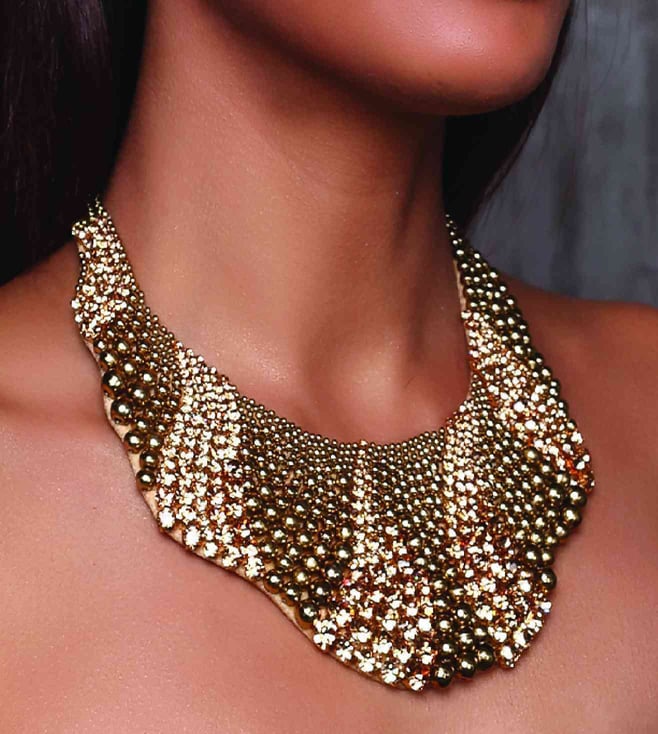 This necklace is embroidered on a silk base using metal beads and diamond crystals. It comes with an adjustable metal chain. To maintain well, wipe it gently after use and store it in a muslin cloth or a dust bag. Disclaimer: Product colour may slightly vary due to photographic lighting sources. Country of Origin - India.