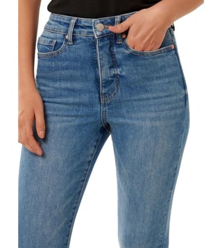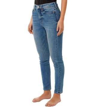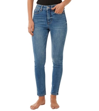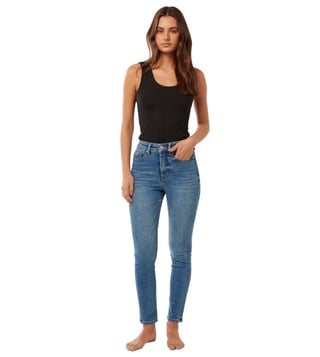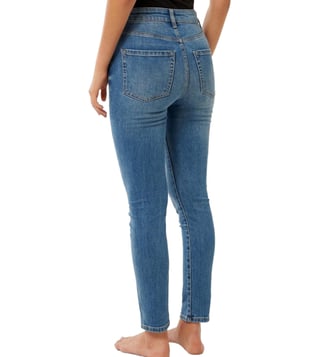 Explore comfort and style with Forever New Blue Cotton Skinny Jeans for women. Perfect for casual wear, these jeans offer a flattering fit and versatile fashion for everyday outfits. Disclaimer: All other items in the image are only for display purposes and will not be a part of the delivery content. Product colour may slightly vary due to photographic lighting sources. Country of Origin - India.