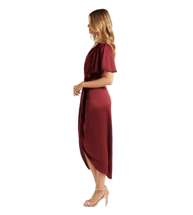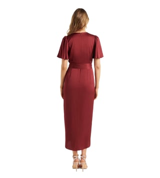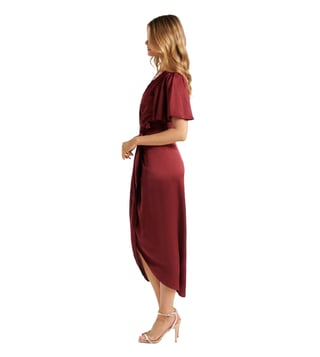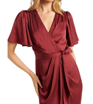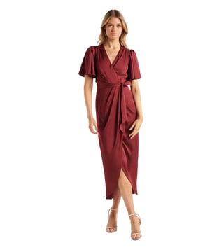 Enrich your repertoire to prepare well for the new season's evenings with this gorgeous dark red wrap dress from the latest collection of Forever New. Beautifully tailored in premium poly viscose for luxurious softness and feel packed with fine sheen and excellent drape, it's vibrant color-block pattern and trendy V-neck design should get you bouquets of compliments. Pair it with matching heels for a stunning look.