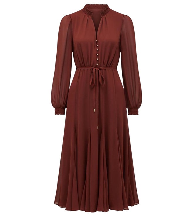 Embrace the fiery allure of this classic red dress. Crafted from smooth polyester, it drapes effortlessly with a flattering regular fit. The V-neckline adds a touch of sophistication, while the full sleeves provide coverage and elegance. A chic belt cinches the waist, accentuating your curves and creating a timeless silhouette. Perfect for a romantic evening out or a stylish daytime event, this dress is sure to turn heads with its vibrant hue and timeless design.