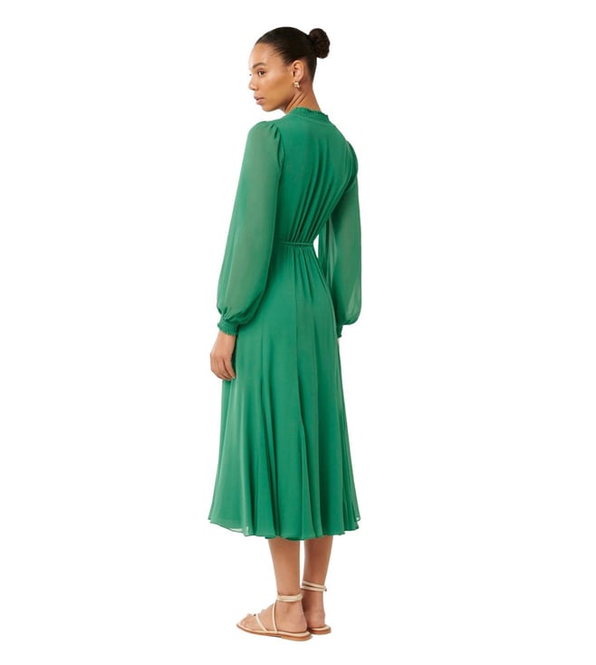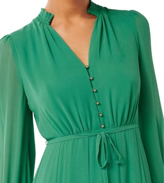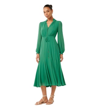 Add an extra dose of style to your casual wardrobe with this green midi dress from Forever New. Made from high quality fabric, this midi dress will keep you sweat free all day long. Featuring a v neck, full sleeves and solid pattern, this midi dress boasts of chic charm. Make heads turn by teaming this midi dress with a pair of stilettos.
