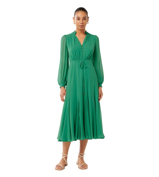 Add an extra dose of style to your casual wardrobe with this green midi dress from Forever New. Made from high quality fabric, this midi dress will keep you sweat free all day long. Featuring a v neck, full sleeves and solid pattern, this midi dress boasts of chic charm. Make heads turn by teaming this midi dress with a pair of stilettos.