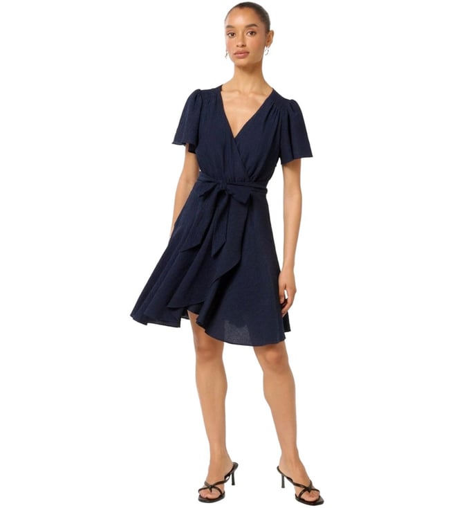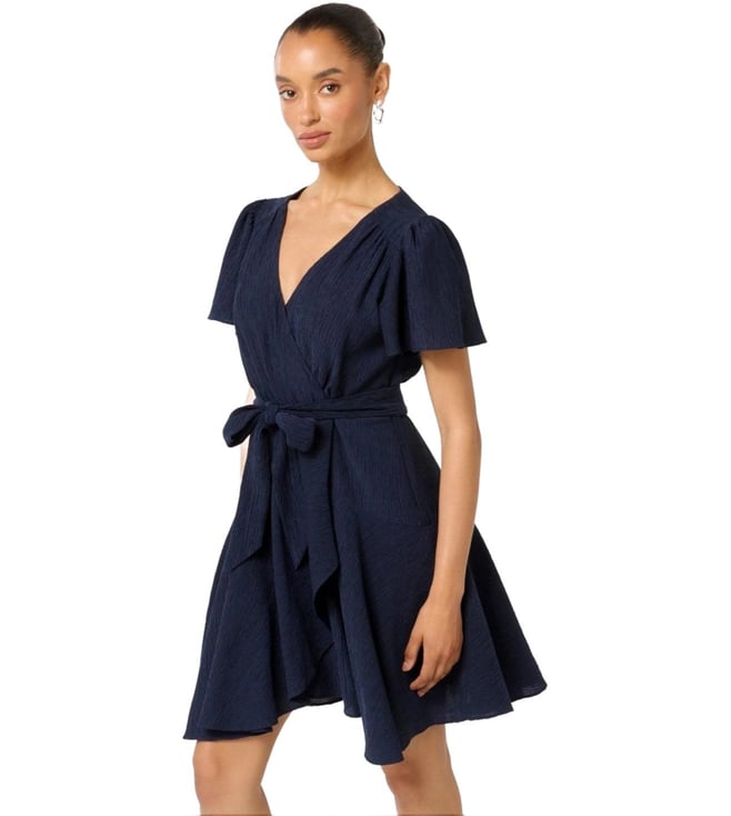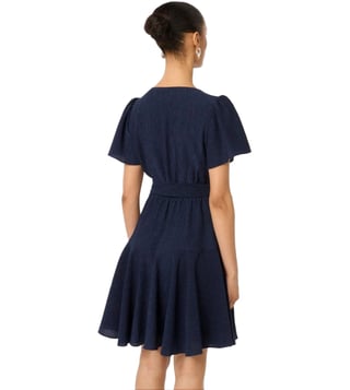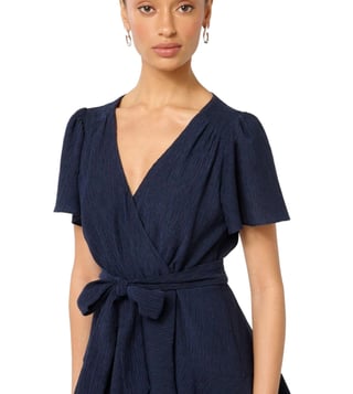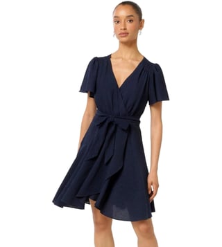 Pep up your wardrobe with this navy dress with belt from Forever New. Tailored to sartorial perfection from premium quality fabric, it assures a soft and soothing touch against the skin. The V-neckline adds to its appeal. Exuding short sleeves, it is sure to fetch you compliments from all.