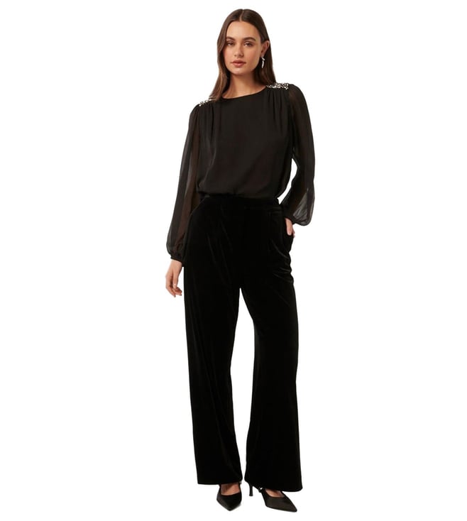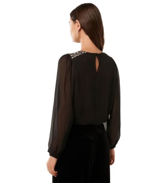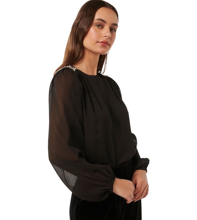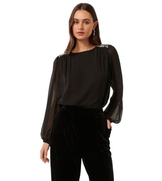 Elevate your party wardrobe with the Dolly Beaded Yoke Blouse from Forever New. Crafted from black polyester, this women's blouse features full sleeves, perfect for club wear. Disclaimer: All other items in the image are only for display purposes and will not be a part of the delivery content. Product colour may slightly vary due to photographic lighting sources. Country of Origin - India.