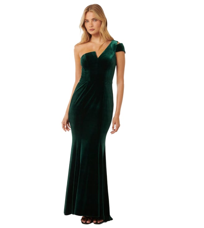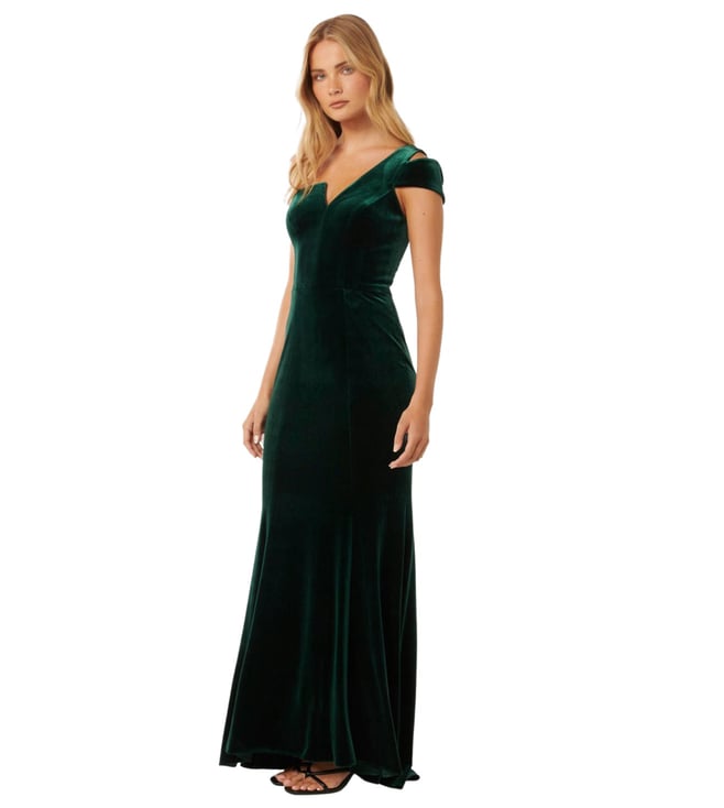 Experience elegance with the Forever New Hunter Green Fitted Gown. Perfect for parties, this women's dress combines style and comfort in a stunning hue. Disclaimer: All other items in the image are only for display purposes and will not be a part of the delivery content. Product colour may slightly vary due to photographic lighting sources. Country of Origin - India.