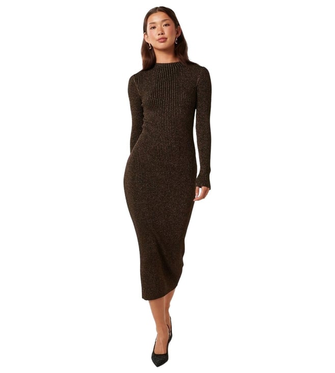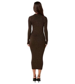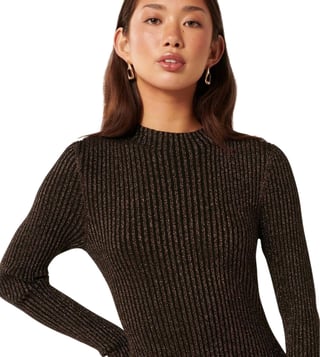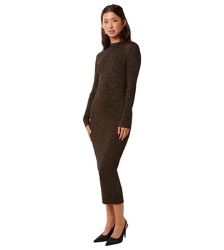Embrace effortless elegance in this body-hugging midi dress. Crafted from a luxurious metallic ribbed knit, it drapes beautifully with a comfortable feel. The high neckline and long fitted sleeves create a sophisticated silhouette, while the fitted column midi skirt adds a touch of timeless style. Made with sustainably sourced Lenzing Ecovero viscose, this dress is both chic and conscious. Available in sizes AU 8/XS to 14/L.