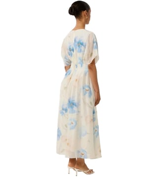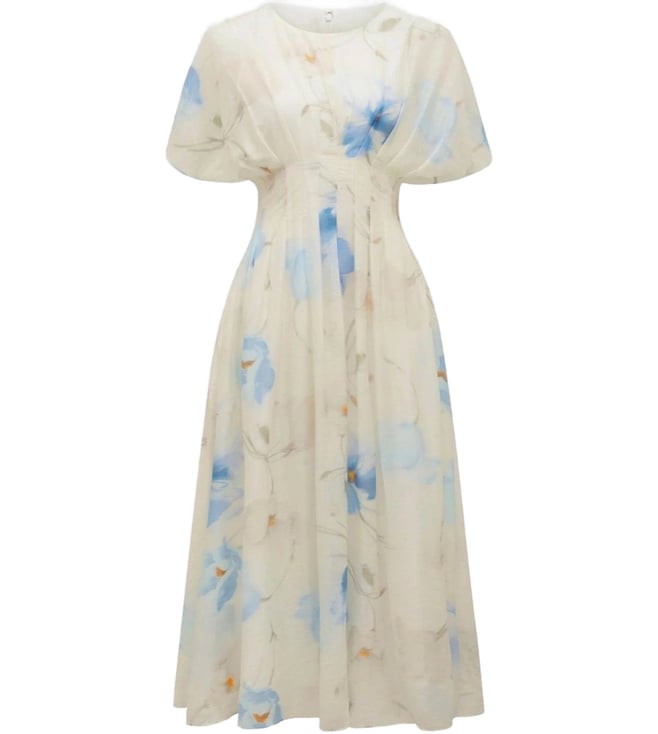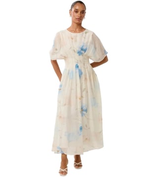 Induce a dash of style to your wardrobe with this beige regular fit dress from Forever New. Tailored to sartorial perfection from premium quality fabric, it assures a soft and soothing touch against the skin. The round neck adds to its appeal. Exuding short sleeves, it is sure to fetch you compliments from all. The floral print makes it a bewitching choice.