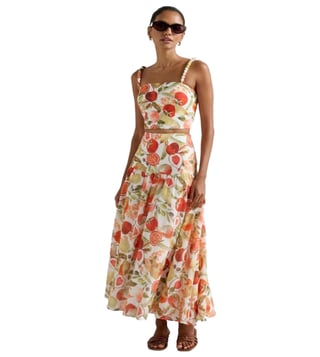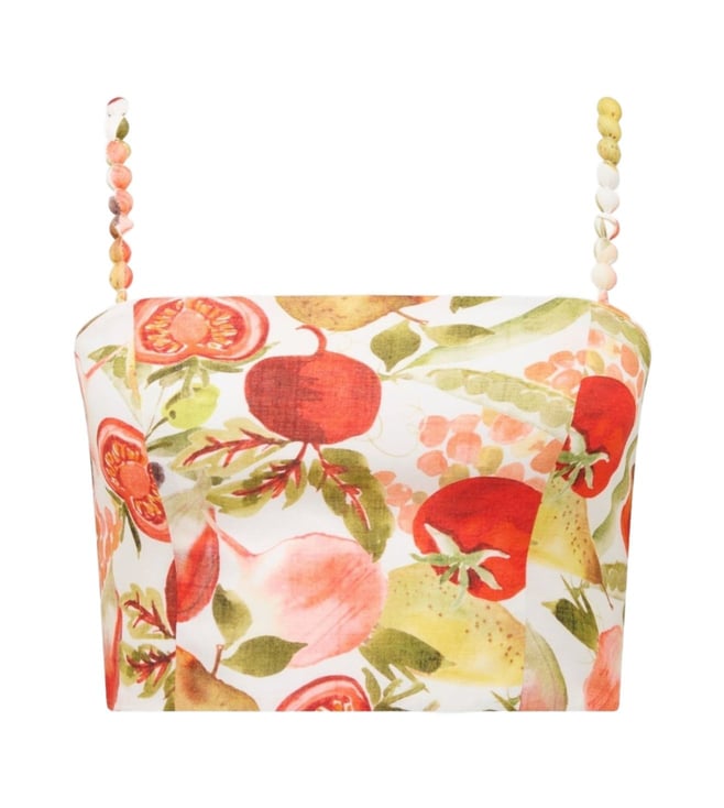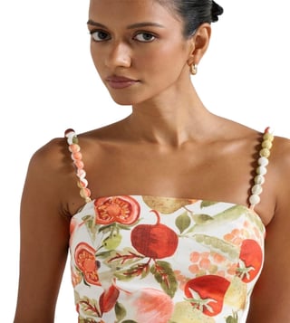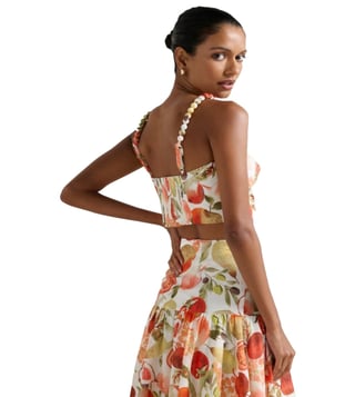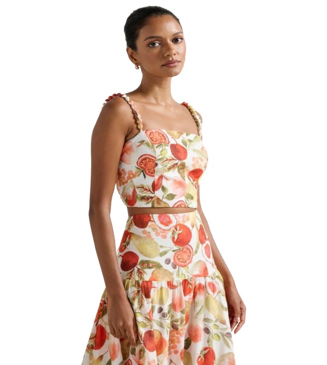 The Forever New Flore Petite Printed Top is a vibrant and stylish choice perfect for warm weather or resort wear. Crafted from premium cotton this tailored top features a square neckline and adjustable beaded straps that add a delicate touch. The shirred back panel provides a comfortable fit while the cropped length creates a fresh and modern silhouette. Fully lined and finished with a concealed zip fastening this top pairs beautifully with matching skirts or high waisted pants for a coordinated and chic look. Ideal for sunny days this top combines comfort and elegance effortlessly.