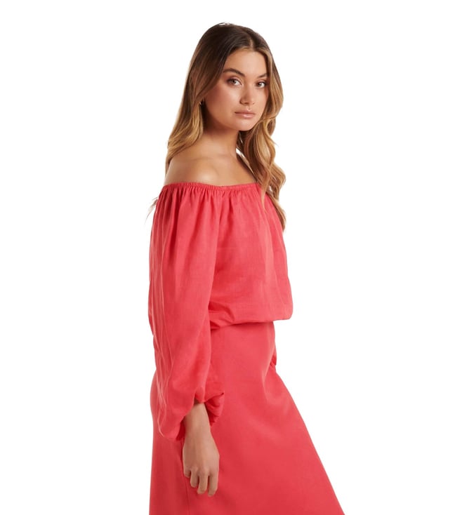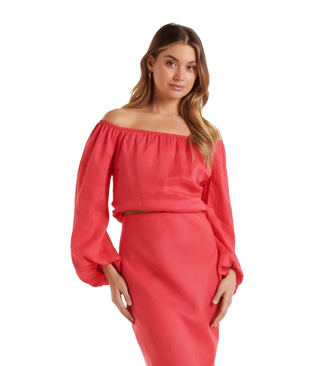 Give yourself an ultra modern casual look with this coral top from Forever New. Made from linen fabric, this top has regular fit for your convenience. Featuring a off shoulder, full sleevess and solid pattern, this top possesses a stylish enchantment. Team this top with a pair of denims and heels for a stylish look.