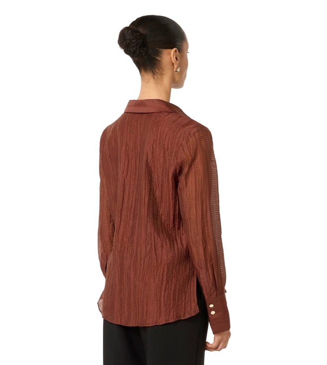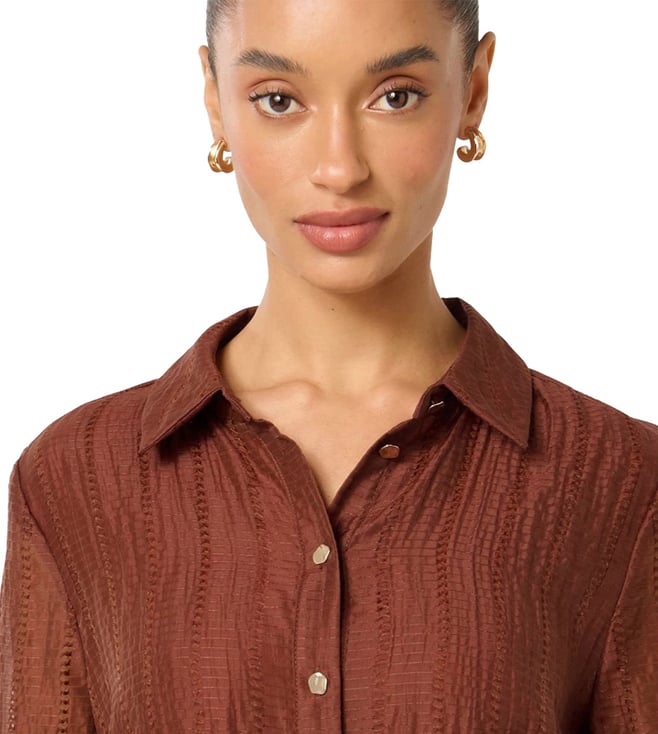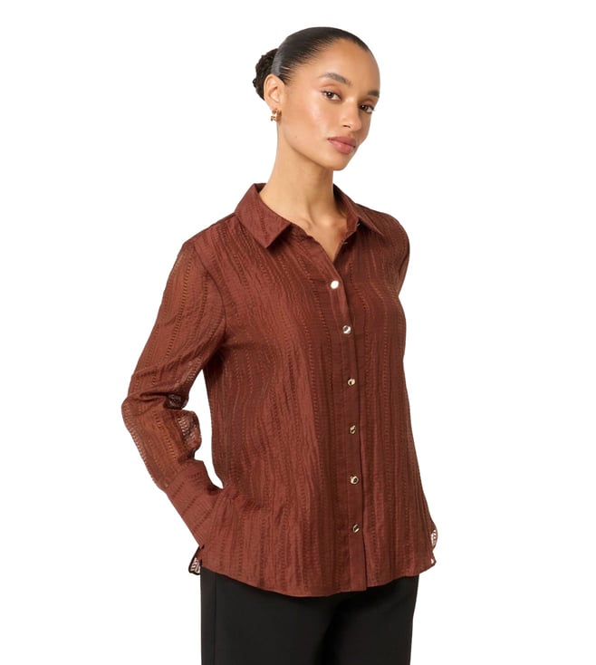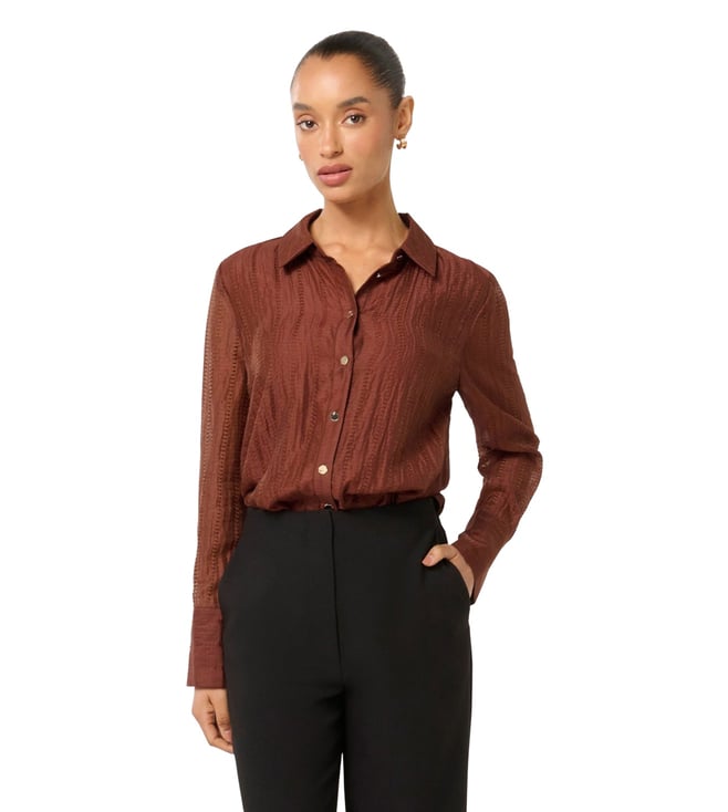 Build your casual wardrobe with this classic brown shirt from Forever New. Made of high quality fabric, this regular fit shirt is extremely comfortable to wear. Featuring a shirt collar, full sleeves and textured pattern this shirt boasts of exclusive appeal. Create a sophisticated style by teaming this shirt with a pair of jeans and strappy sandals.