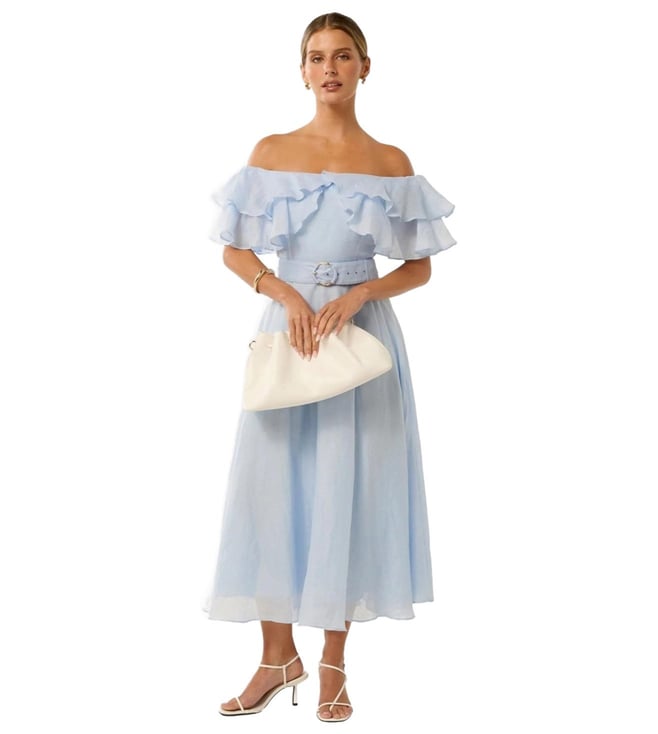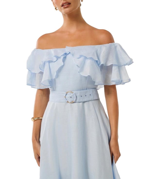 Embrace effortless elegance in this breezy blue midi dress crafted from luxurious ramie. The off-shoulder silhouette flatters your neckline, while the sleeveless design keeps you cool and comfortable. The solid color and regular fit create a timeless and versatile look, perfect for everything from casual outings to special occasions. The soft cotton lining ensures a smooth and comfortable wear.