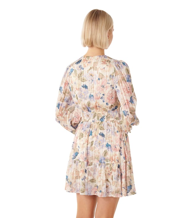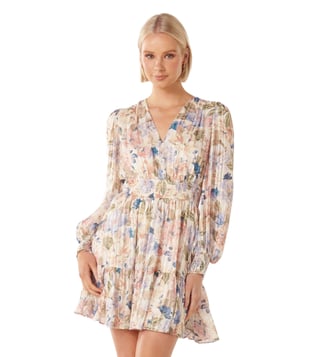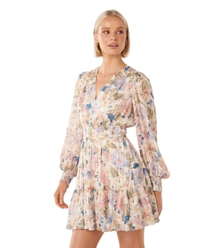 Pamper the style diva in you with this awesome multihued A-line dress from the latest collection of Forever New. Beautifully crafted in premium polyester with metallised fibre for a nice lustre, supple demeanour and excellent comfort, it's elegant floral pattern makes it a natural fashion choice. Pair it with matching heels for a stunning look.