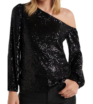 Fall in love with the latest global trends imbued in the vibrant hues of this stylish black off-shoulder blouse from the latest offering of Forever New. Beautifully crafted in premium stretch polyester for flexibility and fine lustre combined with a soft touch and unmatched comfort, it's versatile metallic pattern and well-engineered regular fit silhouette make it a much desired piece. Pair it best with denims for an alluring look.