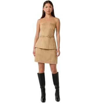 Score high on the fashion meter by wearing this brown one-shoulder sleeveless skirt from Forever New. Tailored to sartorial perfection from premium quality fabric, it assures a soft and soothing touch against the skin.